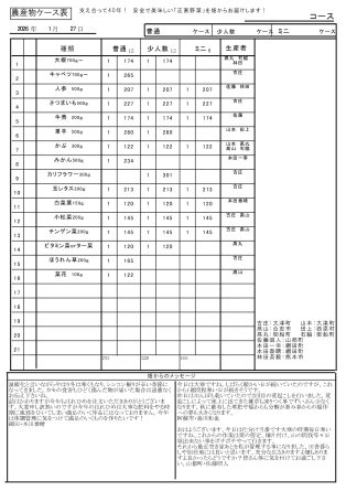 1/27(火)配送の野菜ケース(金曜コースの野菜ケースもこれに準じたものになります)